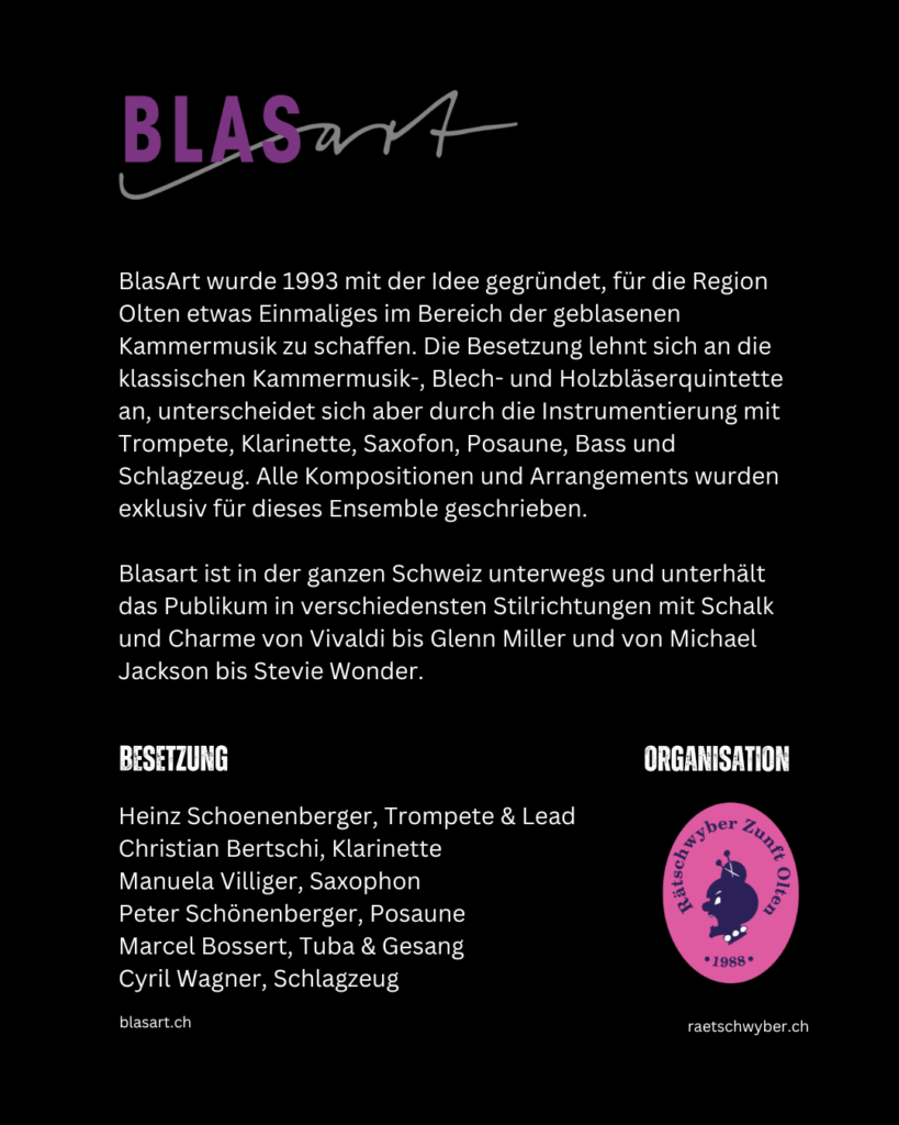 Freuen Sie sich auf insgesamt 60 Minuten 🎺Blasmusik, aufgeteilt in drei abwechslungsreiche Sets zu je 20 Minuten. Das Repertoire reicht von Folk und Dixie über Pop und Rock bis hin zu Swing – ein vielfältiges Programm, das garantiert für jeden Geschmack etwas bereithält. Geniessen Sie einen entspannten Ausklang des Tages in geselliger und gemütlicher Atmosphäre.